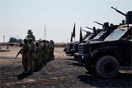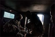 Raqqa, February 9, 2025 – Fighters of the Hezen Komandos, the elite unit of the Syrian Democratic Forces, disembark from their armoured vehicle during a patrol in the streets of Raqqa. The soldiers are mainly maintaining a presence to prevent ISIS sleeper cells, still remaining in some neighbourhoods of the city, from taking action.