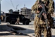 Raqqa, February 9, 2025 – Fighters of the Hezen Komandos, the elite unit of the Syrian Democratic Forces, watching Clock Tower Square during a patrol through the streets of Raqqa. The soldiers are mainly maintaining a presence to prevent ISIS sleeper cells, still remaining in some neighbourhoods of the city, from taking action.