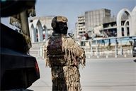 Raqqa, February 9, 2025 – A member of the Hezen Komandos, the elite unit of the Syrian Democratic Forces, watching Clock Tower Square during a patrol through the streets of Raqqa. The soldiers are mainly maintaining a presence to prevent ISIS sleeper cells, still remaining in some neighbourhoods of the city, from taking action.