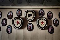Raqqa, February 9, 2025 – Emblems of the Syrian Democratic Forces, the YPG and the YPJ, along with portraits of fighters from the communication department.