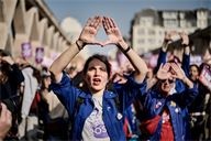 Protesters from "Nous Vivrons" collective during the feminist march organized on International Women's Day in Paris on March 8, 2026.