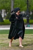 A guest arrives barefoot at the national tribute to Lionel Jospin at the H么tel des Invalides in Paris on 26 March 2026.
