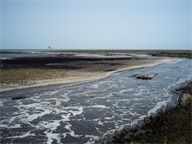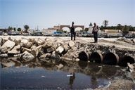 Nazih and Meherz, fishermen from the city of Gabes, observe the pollution in the mouth of a small, polluted river near the Gabes fishing port.