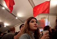 Syriza supporters celebrate after the first exit polls, as they gather at the Syriza election kiosk in Athens on January 25, 2015. Radical left-wing party Syriza appeared to be heading for a clear victory in Greece's election, exit polls showed, which would allow it to challenge the course of austerity in Europe. Syriza took between 35.5 percent and 39.5 percent of the vote, according to the polls, compared to between 23 percent and 27 percent for the conservative New Democracy party of incumbent Prime Minister Antonis Samaras.