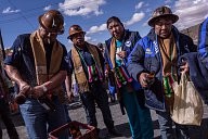 February 2017 - Bolivia / Oruro - Dancers drink before the parade - A few days before the official carnival, the miners march down the hill to the mine for hours, gathering their own ancestral beliefs to the Christian rites imported by the Spanish . Drinks and folklore spread for hours. This parade remains relatively poor, the modest level of minors, and does not include directly in the official carnival. The carnival of Oruro is the biggest annual cultural event of Bolivia. Carnival celebrated in the city of Oruro, the capital of folklore of the country, it is part of the festival Ito in honor of the Uru people. "The Oruro Carnival" was inscribed in 2008 by UNESCO on the Representative List of the Intangible Cultural Heritage of Humanity.