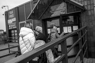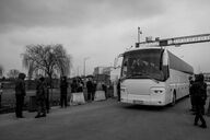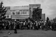 In front of Mlyny's shopping center transformed into a temporary reception center, women and children are waiting to board buses that will take them to different destinations in Europe. According to the UN, since the beginning of the invasion of Ukraine by the Russian army, almost one million people have fled the country. March 3, 2022. Mlyny. Poland.