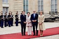 Prime Minister of Luxembourg Luc Frieden and his wife Marjolijne Fortuyn-Frieden received by French President Emmanuel Macron and his wife Brigitte Macron at the Elysee Palace for the launch of Paris 2024 Olympic Games, on July 26, 2024.