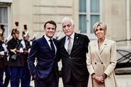 President of Latvia Edgars Rinkevics received by French President Emmanuel Macron and his wife Brigitte Macron at the Elysee Palace for the launch of Paris 2024 Olympic Games, on July 26, 2024.