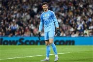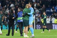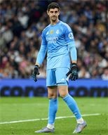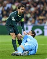 Thibaut Courtois of Real Madrid CF and Bernardo Silva of Manchester City FC during the UEFA CHAMPIONS LEAGUE match between Real Madrid CF and Manchester City FC at Bernabeu stadium on December 10, 2025.