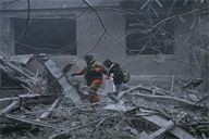 A 14h30, deux missiles balistiques Iskander chargés de 500 à 700 kfg d'explosifs, ont frappés deux immeubles résidentiels sur la rue Olesya Honchalea, en plein centre de la ville. Le bilan serait de 30 blessés et deux morts, et femme et son garçon de 3 ans. Les recherches se poursuivent dans les décombres.Les équipes de secours observent un balcon en cours d'éffondrement. Photographié par Nicolas Cleuet / Agence Le Pictorium