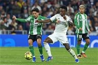 Aurelien Tchouameni of Real Madrid CF battles for the ball with Nelson Deossa of Real Betis Balompie during the La Liga EA Sport match between Real Madrid CF and Real Betis Balompie at Bernabeu stadium on January 4th, 2026.
