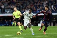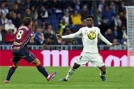 Vinicius Junior of Real Madrid CF battles for the ball with Jeremy Toljan of Levante UD during the La Liga EA Sport match between Real Madrid CF and Levante UD at Bernabeu stadium on January 17th, 2026.