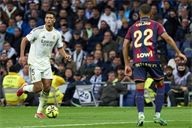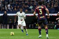 Aurelien Tchouameni of Real Madrid CF battles for the ball with Jon Ander Olasagasti of Levante UD during the La Liga EA Sport match between Real Madrid CF and Levante UD at Bernabeu stadium on January 17th, 2026.