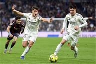 Arda Güler of Real Madrid CF battles for the ball with Adrian de la Fuente of Levante UD during the La Liga EA Sport match between Real Madrid CF and Levante UD at Bernabeu stadium on January 17th, 2026.