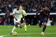 Vinicius Junior of Real Madrid CF battles for the ball with Jorge Cabello of Levante UD during the La Liga EA Sport match between Real Madrid CF and Levante UD at Bernabeu stadium on January 17th, 2026.