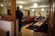 September 14, 2016: Lay people who have come to follow the teachings at the monastery or work there share the monks' meal. Apart from a blessing at the beginning of the meal, discussions are allowed and exchanges are warm. Labastide-Saint-Georges (81), France.