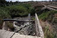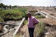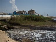 Gabes, June 3, 2016. Water flows from the National Sanitation Office (ONAS) wastewater treatment plant into the sea. Phosphogypsum discharged by the chemical phosphate processing plant accumulates daily, blocking the water's flow onto the beach. Nazih Aouidi and the Chott Essalem Association for Sustainable Development dig a trench twice a month to prevent the polluted water from stagnating on the beach.