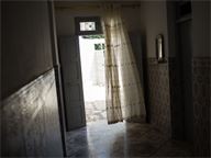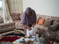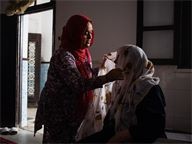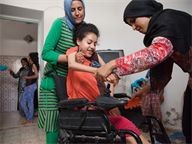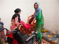 Jalila, mother of 15-year-old Jihan, who suffers from a disease that has caused her to progressively lose the use of her muscles, and her sister help her into her wheelchair. Today, she can no longer stand upright and is confined to lying down and moving around in a wheelchair. Her brother, Ali, 8, suffers from the same disease and will also lose the use of his muscles.
