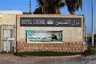 Poster for the "Stop Pollution" event, addressing the environmental, social, and health crises in the Gabes oasis, is displayed at the entrance of the hotel hosting participants.