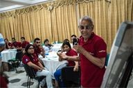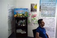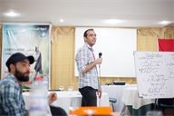 Gabes, June 3, 2016. Activist Mohamed Jridi, co-organizer of the "Stop Pollution" event, moderates a report on a workshop held on the first day. Their goal is to raise awareness among public authorities and citizens of Gabes in order to compel the Tunisian Chemical Group (CGT) and all factories in the industrial zone to comply with national and international environmental protection conventions. They are also advocating for the introduction of new, less polluting technologies in the factory's production.