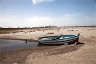 An abandoned fishing boat on the beach in Gabes, in front of the Chott Essalem oasis. The port of Gabes now has approximately 250 coastal fishermen, compared to 500 to 800 previously. The majority have ceased fishing due to a lack of fish. Only the largest boats, capable of traveling more than 30 km, are allowed to go out, but they are forced to venture further and further afield, towards Sfax to the north, the Libyan coast, or Italy.