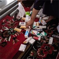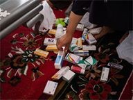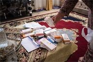 Gabes. Chott Essalem Oasis. June 4, 2016. The wife of farmer Mohamed Chairat is suffering from respiratory failure. She unpacks all her medications.