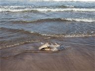On the beach at Gabes, a beached turtle is decomposing. Toxic and polluting waste discharged by the Tunisian Chemical Group (GCT) plant has killed all marine life since the 1990s. The Gulf of Gabes was an important breeding ground for fish and marine animals.