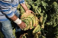 Gabes. Chott Essalem Oasis. June 4, 2016. A farm worker spreads out tobacco plants to dry.