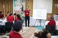Gabes, June 3, 2016. Participants during the Stop Pollution event during their workshop presentation. The goal of the Stop Pollution event is to raise awareness among public authorities and citizens of Gabes in order to compel the Tunisian Chemical Group (CGT) and all factories in the industrial zone to comply with national and international environmental protection conventions and advocate for the introduction of new, less polluting technologies in the factory's production.