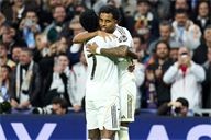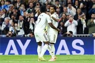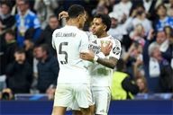 Rodrygo of Real Madrid CF celebrates his goal with Jude Bellingham of Real Madrid CF during the UEFA CHAMPIONS LEAGUE match between Real Madrid CF and Manchester City FC at Bernabeu stadium on December 10, 2025.