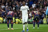 Vinicius Junior of Real Madrid CF battles for the ball with Jorge Cabello of Levante UD during the La Liga EA Sport match between Real Madrid CF and Levante UD at Bernabeu stadium on January 17th, 2026.