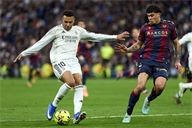 Kylian Mbappe of Real Madrid CF battles for the ball with Alan Matturro of Levante UD during the La Liga EA Sport match between Real Madrid CF and Levante UD at Bernabeu stadium on January 17th, 2026.