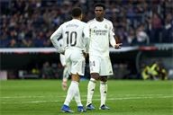 Aurelien Tchouameni and Kylian Mbappe of Real Madrid CF during the La Liga EA Sport match between Real Madrid CF and Levante UD at Bernabeu stadium on January 17th, 2026.