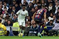 Vinicius Junior of Real Madrid CF battles for the ball with Jeremy Toljan of Levante UD during the La Liga EA Sport match between Real Madrid CF and Levante UD at Bernabeu stadium on January 17th, 2026.