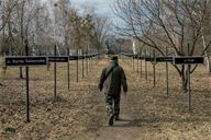 A former liquidator walks between signs indicating towns evacuated following the nuclear disaster. On April 26, 1986, reactor 4 of the Chernobyl nuclear power plant exploded, causing the worst nuclear disaster in the history of civilian nuclear power. Forty years later, within the exclusion zone, the site’s infrastructure continues to be operated and secured despite Russia’s invasion of Ukraine.